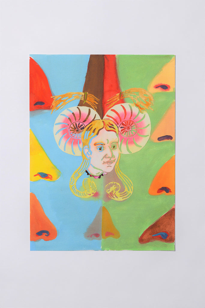 The mask arrives onto the two background images, fluttering across the paper and alighting temporarily, finding itself suddenly part of a pre-existing landscape. For Katz, there is a sense of movement across motifs. The work embodies a feeling of transience - as on a stage, in a life, while constructing identity - that which can be taken on and off. These two prints, reproduced from recent drawings, already play with games of subjectivity. Noses, head-on or in profile, like masks, can be made to stand in as a surrogate for the whole, imagined identities are doodled or concealed by the edges of the page, a partial view, masked.