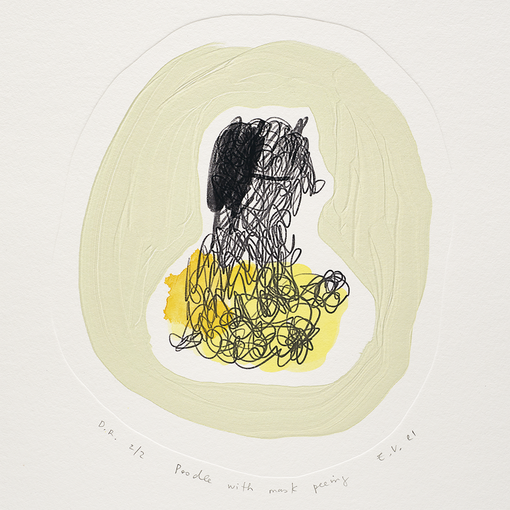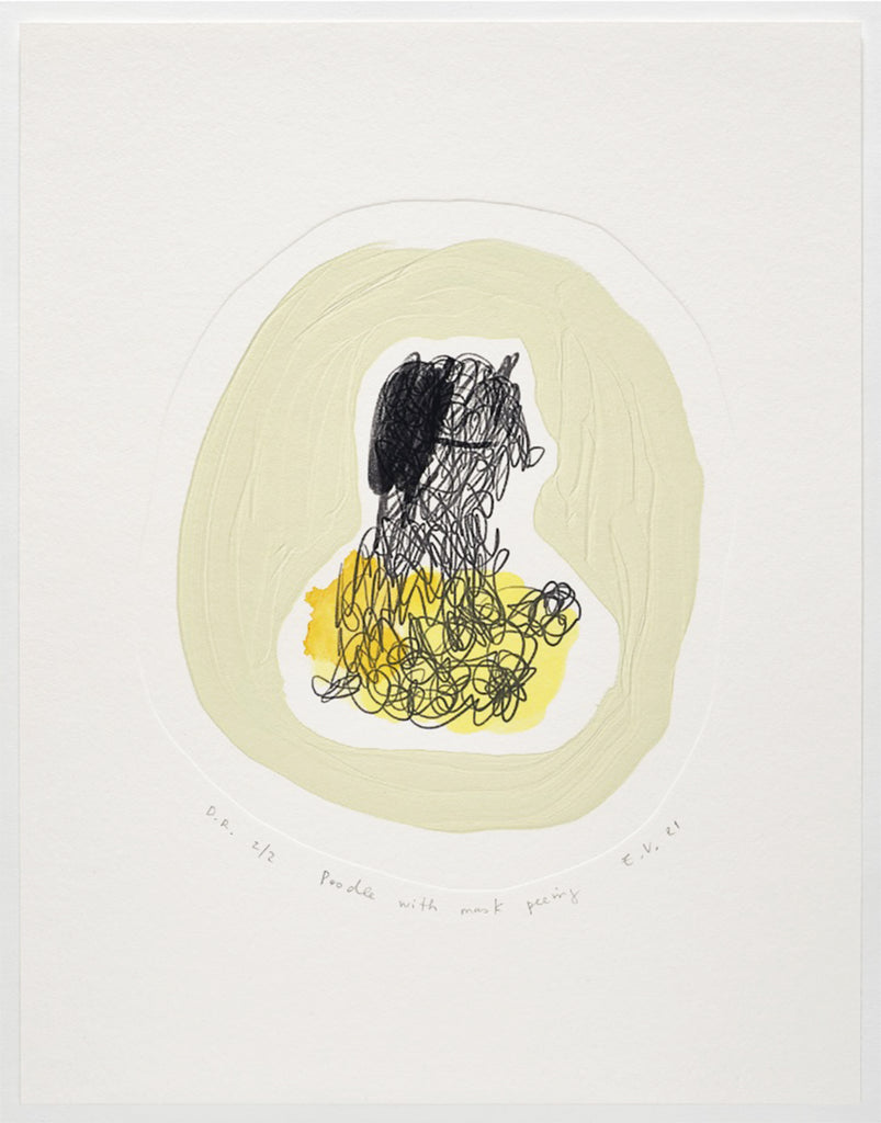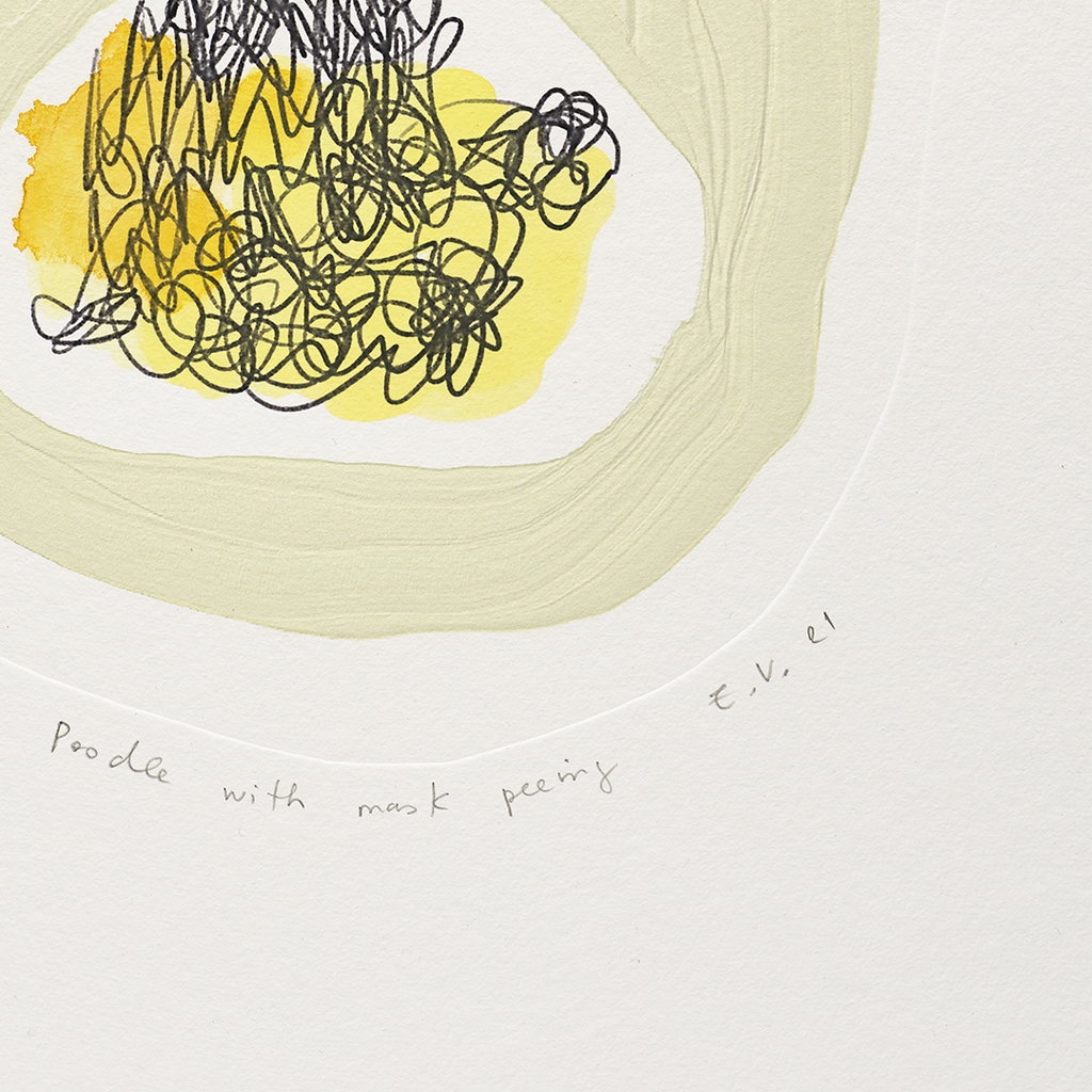 For Poodle with Mask Peeing, 2021, the digital drawing is printed onto paper. To this, Verzutti integrates process and subtle illusion which playfully disrupts the surface. The impasto ‘brushstroke’ which frames the poodle, appears in relief, but is flat; a debossed line traces the outline of the drawing, resembling an awry etching plate-mark. Verzutti has then hand-painted each print with a splash of yellow watercolour. The combination of elements creates an interplay between flatness and relief, viscosity and liquid, physical and digital form.