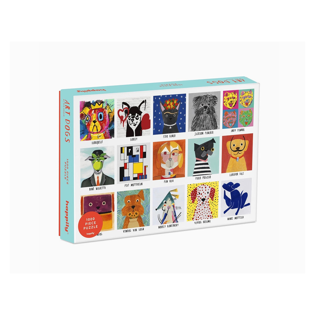 1,000 piece puzzle featuring illustrated ‘art dogs’ by acclaimed illustrator Nia Gould.